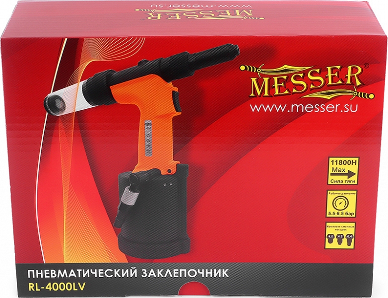 Пневматический вытяжной заклепочник Messer RL-4000LV (Мессер РЛ-4000ЛВ) – надежный профессиональный пневмозаклепочник (пневмо заклепочный пистолет) для установки металлических (алюминиевых, медных, стальных, нержавеющих стальных) вытяжных заклепок Ø 4,0 – 6,4 мм.